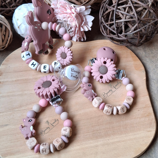 Découvrez notre trio fait main en silicone, composé d'une attache-tétine, d'une attache-doudou et d'un anneau de dentition, tous personnalisés avec le prénom de votre enfant. Pratiques, sécurisés et uniques, ces accessoires sont parfaits pour allier style et utilité au quotidien