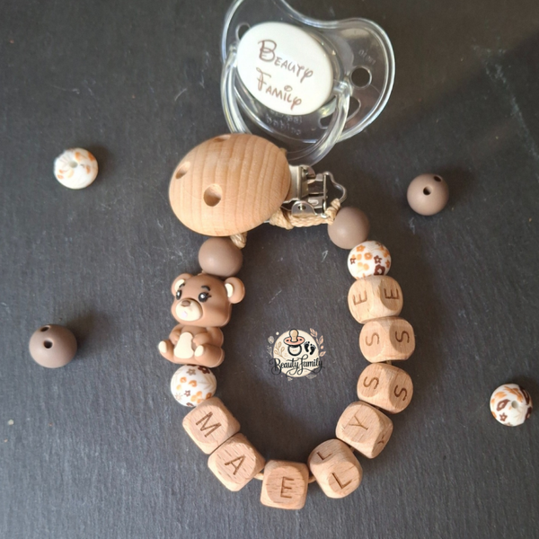 Avec son adorable petit ourson brun et ses perles aux tons chauds et naturels, elle accompagne bébé dans un univers doux et rassurant, tout en gardant sa tétine toujours à portée de main.