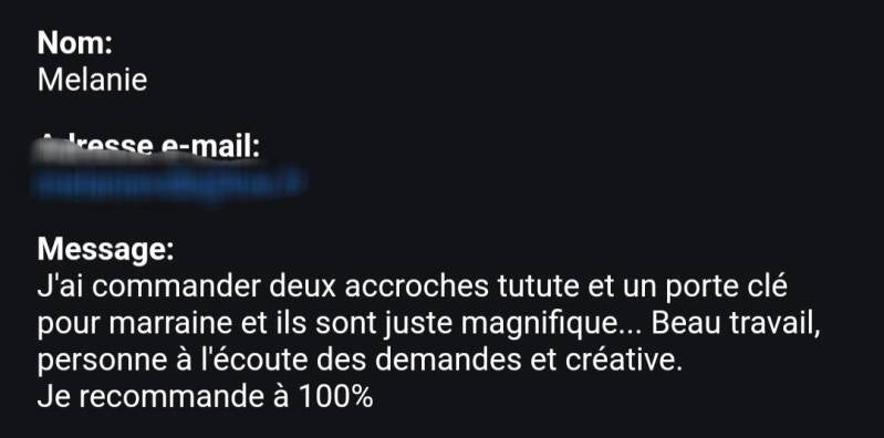 Ayant récemment commandé une attache tétine, je tiens a remercier la créatrice pour sa réactivité, sa rapidité autant dans l'envoi, que dans le service. Très polie et répond très bien a toutes les demandes. Je recommande et je n'hésiterai pas si je devais refaire une nouvelle commande.